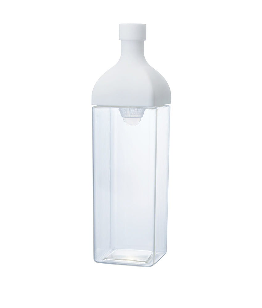 Cold brew tea bottle with a square body ideal for horizontal storage. The attached filter enables you to pour your drink directly from the bottle.
